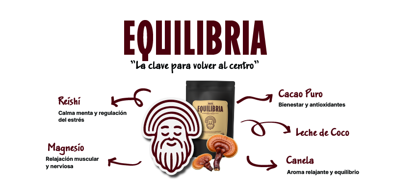 El Blend Equilibria combina Hongo Reishi, Citrato de Magnesio, Cacao y Canela en una formulación cuidadosamente diseñada para promover el equilibrio físico y mental.