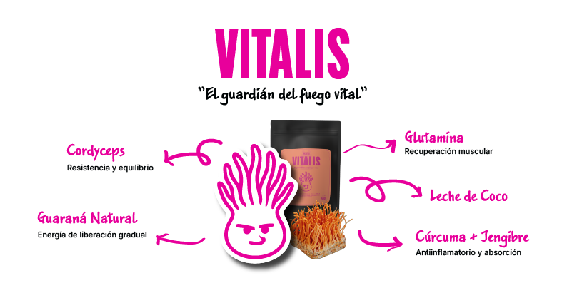 Gracias a su combinación en dosis efectivas y respaldadas por la ciencia, el exclusivo Blend Vitalis integra ingredientes naturales de alta calidad que actúan en sinergia para optimizar tu energía y bienestar general. Su fórmula combina Cordyceps, reconocido por mejorar la oxigenación celular y la resistencia física; Glutamina, un aminoácido esencial para la recuperación muscular y el equilibrio del sistema inmunológico; y Cúrcuma, fuente natural de curcuminoides con propiedades antioxidantes y antiinflamatorias.